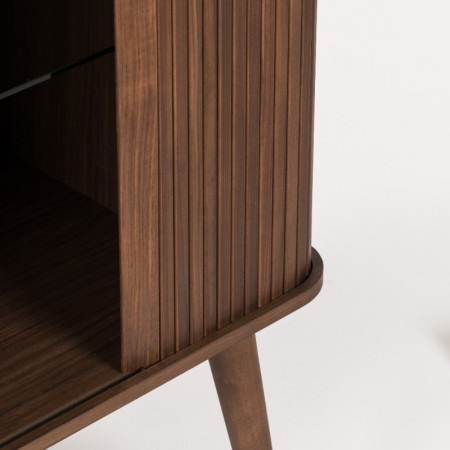 De bas en haut, ce buffet en bois style scandinave se compose de pieds en bois d’hévéa massif de 40 cm de hauteur. 2 grandes portes coulissantes prennent un accent naturel grâce à un placage en noyer. Les étagères en verre trempé de 6 mm d’épaisseur supportent chacune jusqu’à 10 kg. Le plateau de 100 cm x 45 cm accueille votre déco ou vos effets personnels devant rester accessibles.