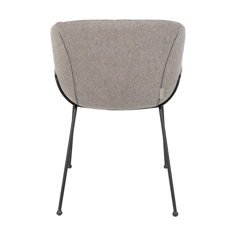 Cette chaise de salle à manger scandinave s’inspire davantage d’une ligne de fauteuil. Le tissu gris recouvre un rembourrage moelleux. La mousse haute densité (35 à 40 kg/m3) assure un maintien optimal, sans être trop ferme. Ce cocon de douceur repose sur un piétement fin et droit en métal poudré noir. Le nom de la marque apparaît discrètement sur une petite étiquette cousue à l’arrière du dossier, s’intégrant naturellement à l’effet design de cette assise.