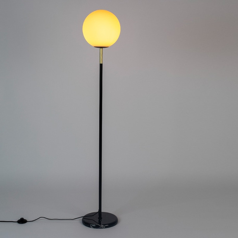 Ce modèle de luminaire repose sur un socle en marbre noir, dont les veines naturelles renforcent l’élégance de l’ensemble. Le globe en verre opaque blanc de 25 cm de diamètre abrite une ampoule E27 de maximum 40 W (non fournie). Le pied ultra fin en métal noir se distingue par une touche dorée à la base du globe. Avec son encombrement réduit, ce lampadaire se pose au sol pour ajouter une luminosité douce, idéale pour se relaxer ou lire un bon livre.