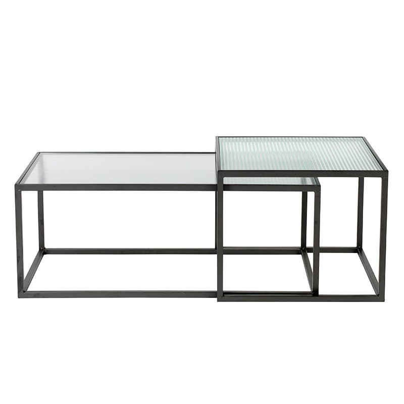 La table basse gigogne en verre design BOLI est aussi pratiques qu'esthétique ! Ajoutez un éclat éternel à votre salon grâce à la table basse en verre rainuré, elle illuminera votre intérieur. La table basse a deux plateaux de tailles différentes. Elle a une structure en métal fer enduit de poudre noir et avec un plateau en verre rainuré. Elles peuvent chacune accueillir un poids allant jusqu'à 10kg. Elles peuvent s'emboîter pour ainsi varier les formes et s'adapter à vos invités.