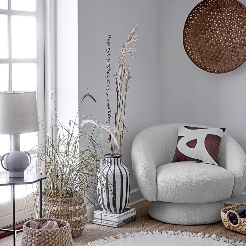 Une ambiance se définit par un style d’intérieur, mais aussi par les objets déco. Si vous souhaitez renforcer une ambiance cosy directement inspirée d’un style ethnique, n’hésitez pas à y ajouter le grand vase déco à poser au sol noir et blanc SCHILA de Bloomingville. Même si vous pouvez profiter de ses larges dimensions pour y glisser de grandes tiges de fleurs séchées ou de bois, ce vase en terre cuite noir et blanc se suffit à lui-même.